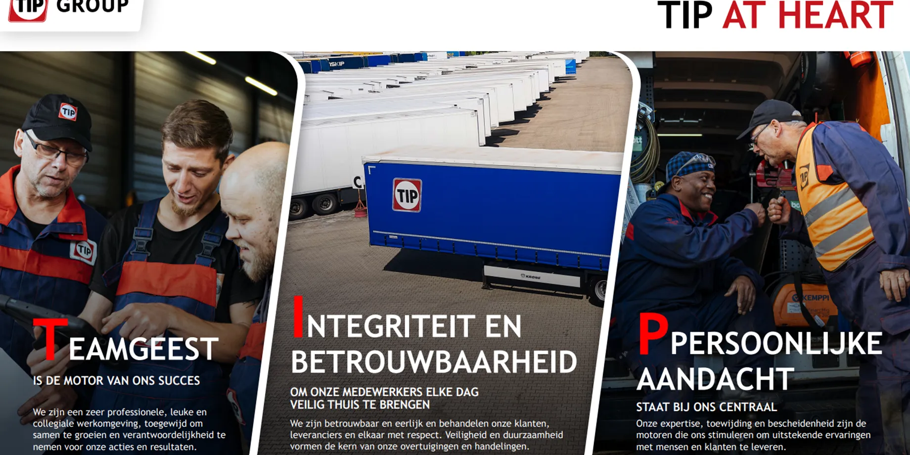 Bij ons draait alles om teamwork en verbonden blijven. We geven onze mensen de middelen en de vrijheid om zich te ontwikkelen terwijl ze gelijke tred houden met de steeds veranderende wereld om ons heen. Bij TIP doen we de dingen graag op onze manier, zonder poespas, gewoon de mouwen opstropen, het voor elkaar krijgen op een nuchtere manier. We geven echt om elkaar, onze klanten en de maatschappij. We zitten allemaal in hetzelfde schuitje en moedigen elkaar aan. We gaan ervoor! Het is eenvoudig: zo doen we dat.